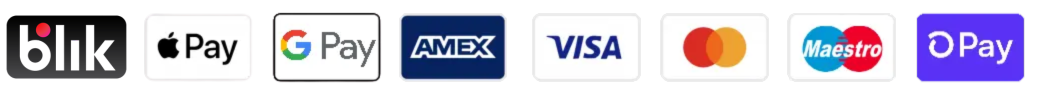 Akceptujemy płatności za pomocą Blik, Przelewy24, PayU, Visa, Mastercard, American Express.